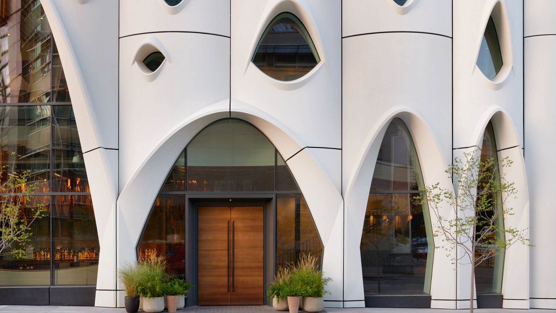 La sostenibilidad en Populus no es un añadido tecnológico posterior. Es estructural y estética. El diseño de la fachada es un ejercicio de biomímesis pura inspirado en el álamo temblón de Colorado (Populus tremuloides), el árbol que da nombre al hotel.