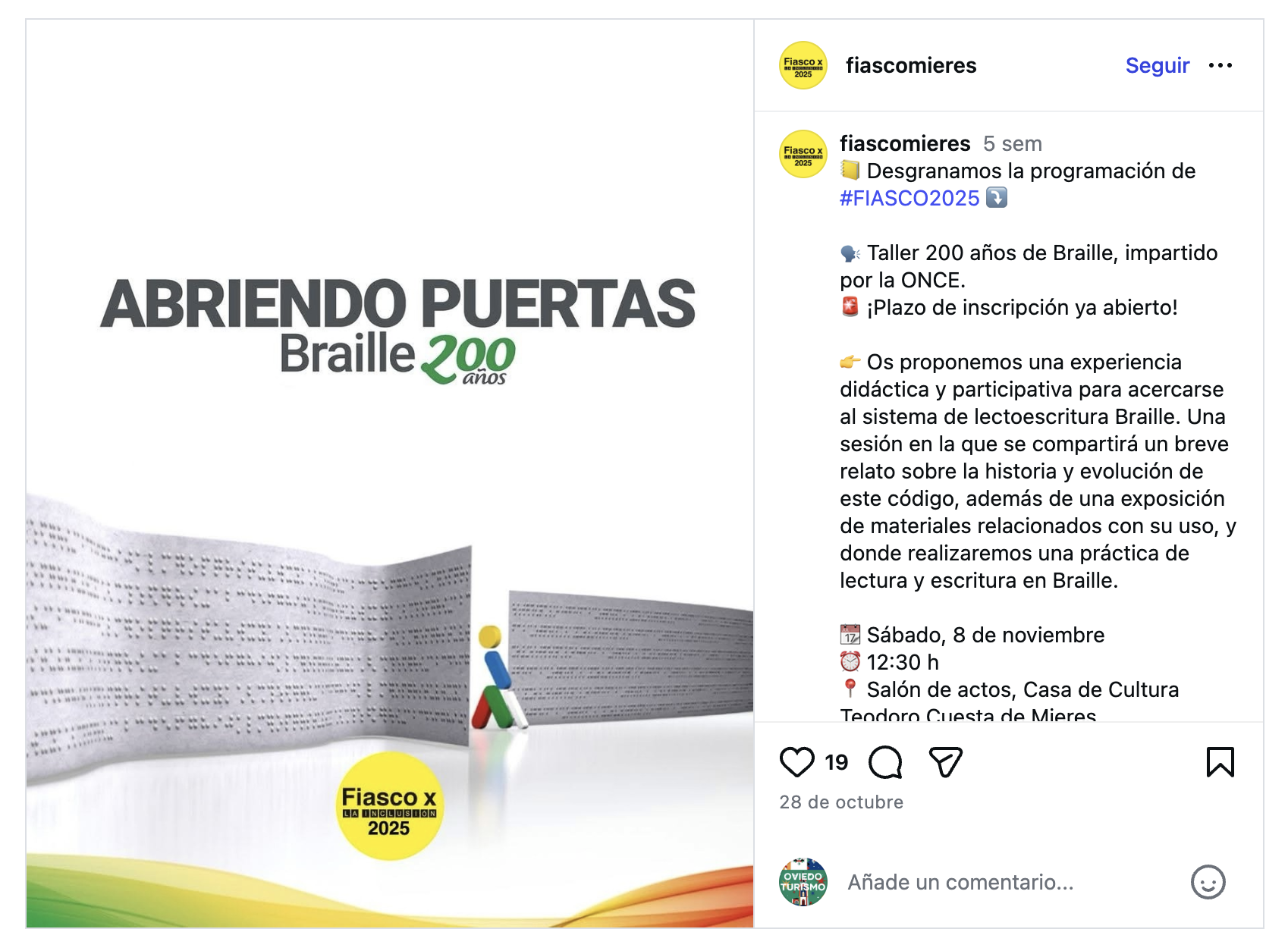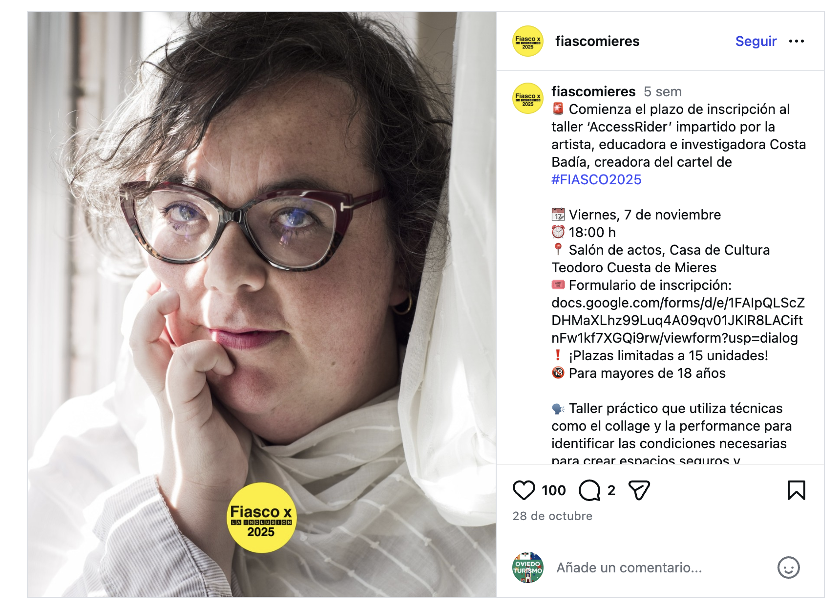 El Festival Fiasco, organizado por Los días felices y El Cohete, es un referente del pensamiento crítico y la cultura alternativa. El reto de esta edición no era solo llenar el aforo, sino comunicar actividades de alta sensibilidad social: un Taller de iniciación al Braille y el taller de cuerpo y movimiento de Costa Badía. La solución «cobarde» habría sido una campaña genérica de «compra tu entrada». Nuestro enfoque fue tratar la inclusividad no como un nicho, sino como el cabeza de cartel.